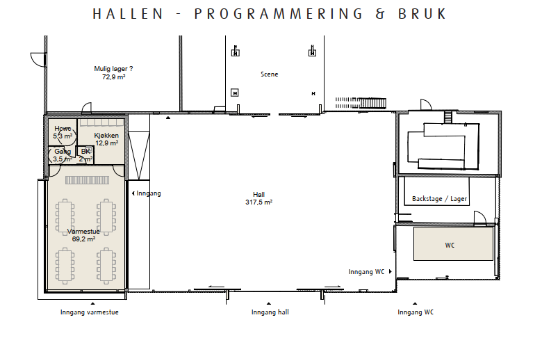 Vi planlegger å bygge et varmt rom inne i hallen, med isolasjon, strøm og oppvarming. Rommet vil inneholde toalett, et enkelt kjøkken samt bord og sitteplasser til opptil 50 personer. Hallen kan åpnes med store dørporter på hver side.