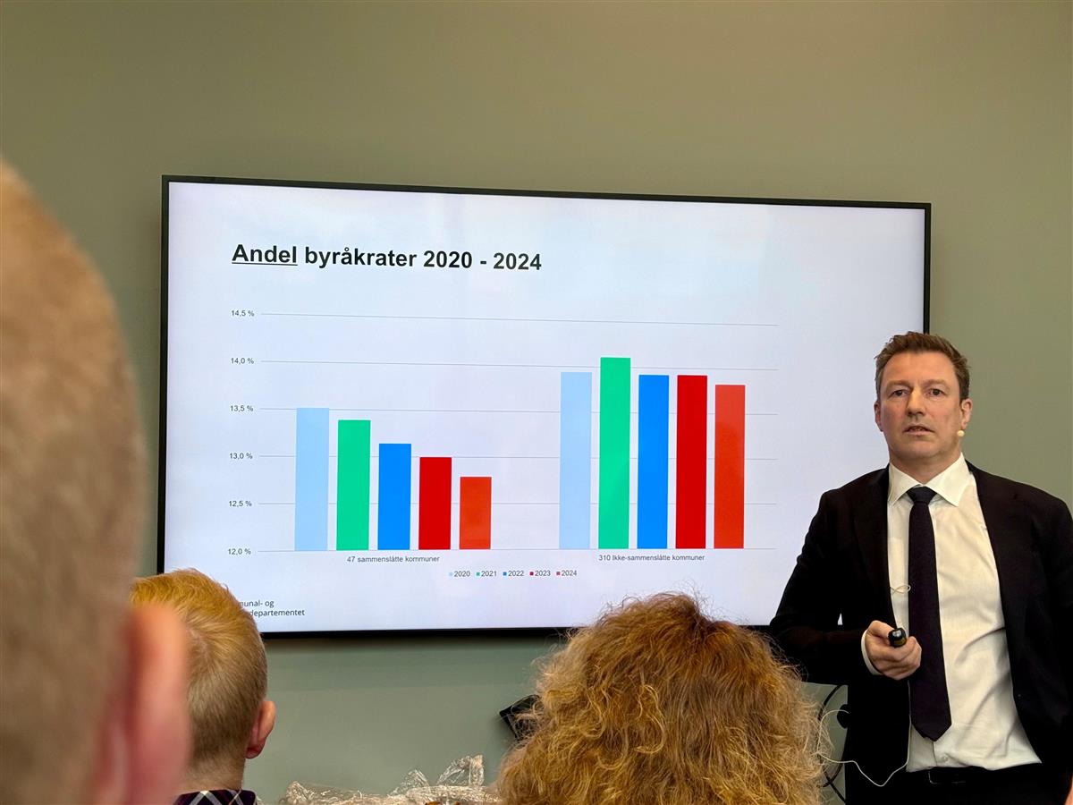 Ett av mange spørsmål rundt en eventuell sammenslåing er antall byråkrater. Her hadde Raaen med seg en skisse som viser utviklingen av andel byråkrater i perioden 2020-2024 (bildet i saken her). Den viser at sammenslåtte kommuner har færre byråkrater i prosent.