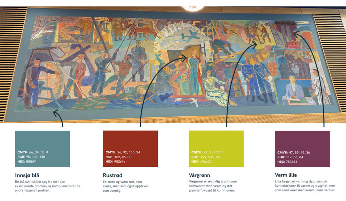 Kommuneplanen samfunnsdelKommuneplanen gir retning for Gjøvik og viser hvilken samfunnsutvikling vi ønsker oss.Her finner du ferdig utarbeidet powerpoint presentasjon, ikoner for hvert innsatsområde og fargepaletten. Last ned presentasjon Last ned powerpointmal - Gjøvik mot 2040NavnLast nedPowerpointmal - Kommuneplanens samfunnsdelLast ned(PPTX, 8 MB) Last ned ikoner for innsatsområder Last ned ikoner for innsatsområder NavnLast ned farget versjonLast ned hvit versjonSkape gode livLast ned(PNG, 250 kB)Last ned(PNG, 245 kB)Kompetanse for framtidaLast ned(PNG, 351 kB)Last ned(PNG, 348 kB)Vekst og attraktivitetLast ned(PNG, 238 kB)Last ned(PNG, 236 kB)Bærekraft og beredskapLast ned(PNG, 332 kB)Last ned(PNG, 346 kB) FargerFargepaletten er hentet fra Fresco maleriet av Jardar Lunde som henger i kommunestyresalen i Gjøvik rådhus. Dette er gjort for å skape en følelse av tilhørighet blant kommunens ansatte, og for å styrke stoltheten ved presentering av den nye kommuneplanen.Fargekoder Fargepalett - Kommuneplanens samfunnsdel FargeHEXRGB (Word, Powerpoint m.m)CMYK (trykksaker)InnsatsområdeVarm lilla#75385117, 56, 8447, 85, 45, 36Skape gode livInnsjø blå#5f8b9195, 139, 14566, 34, 38, 4Kompetanse for framtidaRustrød#F49090244, 144, 1440, 55, 33, 0Vekst og attraktivitetVargrønn#c7ca2 199, 202, 3227, 9, 100, 0Bærekraft og beredskapVarm lilla -tilleggsfarge#DBA5D3219, 165, 21116, 43, 0, 0Skape gode livInnsjø blå - tilleggsfarge#C6E8BF198, 232, 191 28, 0, 33, 0Kompetanse for framtidaRustrød - tilleggsfarge#982e1e152, 46, 3026, 92, 100, 24Vekst og attraktivitetVårgrønn - tilleggsfarge#909B59144, 155, 8948, 25, 73, 8Bærekraft og beredskap Trenger du andre fargetoner? Her finner du hele fargeskalaen som kan benyttes. (PDF, 4 MB)