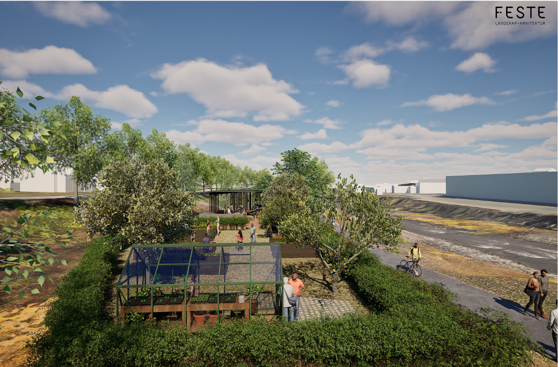 Feste Arkitektur / Landskap har skissert hvordan dyrkningshagen kan se ut ved siden av "bytaket".