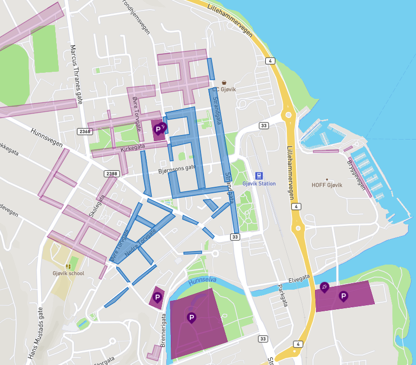 Parkeringsplasser i Gjøvik Hvor kan jeg parkere i Gjøvik sentrum? Kartet viser både private og kommunale parkeringsplasser. OBS! Private parkeringsplasser har andre vilkår, enn kommunale parkeringsplasser. I tillegg er det kantparkeringer i de fleste sentrumsgatene. Spørsmål og svar om parkering Hvor mye koster det å parkere på kommunale parkeringsplasser? Du må betale avgift for å parkere på offentlige parkeringsplasser der det er skiltet.Avgiftstid og pris varierer i ulike soner. Følg derfor skiltingen på stedet der du parkerer.Dagparkering Parkeringsavgifter fra 12. januar 2026 - DagparkeringerOversiktPrisTidspunktSiggeruds gate, sykehuset og Gjøvik stadion38 kroner08-16 hverdagerFastland38 kroner08-16 hverdagerGjøvikstranda38 kroner08-16 hverdagerCampus38 kroner08-16 hverdagerTennishallen38 kroner08-16 hverdager Kommunale parkeringshus Parkeringsavgifter fra 12. januar 2026 - Parkeringshus OversiktPrisTidspunktFarverikvartalet10 kroner per timeTimesparkering hele døgnetNytorvet10 kroner per timeTimesparkering hele døgnet Indre sentrumsone Parkeringsavgifter fra 12. januar 2026 - Indre sentrumsoneOversiktPrisTidspunktTimesparkering indre sentrumsone, time 110 kronerMaks 3 timer. 8-16 hverdager og 10-16 lørdagerTimesparkering indre sentrumsone, time 2+ 20 kronerMaks 3 timer. 8-16 hverdager og 10-16 lørdagerTimesparkering indre sentrumsone, time 3+ 30 kronerMaks 3 timer. 8-16 hverdager og 10-16 lørdager Gjøvik gård, Vitensenteret, Gjøvik sykehus og ytre sentrumsone Parkeringsavgifter fra 12. januar 2026 - Yre sentrumssone OversiktPrisTidspunktGjøvik gård10 kroner per time08-16 hverdagerVitensenteret10 kroner per time08-16 hverdagerKantparkering - ytre sentrumsone10 kroner08-16 hverdagerSykehuset38 kroner per time08 - 16 hverdager Oversikt over HC-plasser i Gjøvik På denne siden finner du oversikt over HC-plasser i Gjøvik sentrum.Hvor kan du parkere når du har HC-parkeringskort?Du kan benytte parkeringstillatelsenpå offentlig reserverte parkeringsplasser for forflytningshemmede.på offentlige avgiftsbelagte parkeringsplasser, uten å betale avgift.på offentlig parkeringsplass inntil dobbel lengde på parkeringstid, unntatt der det er regulert med begrenset parkeringstid for forflytningshemmede.på steder hvor det er innført boligsoneparkering. I Gjøvik finnes det ikke boligsoneparkering, men i en del andre byer. Det er alltid skiltet med boligsoneparkering. Du kan ikke parkerei strid med vegtrafikklovens, trafikkreglenes og skiltreglenes bestemmelser om stans og parkering.på parkering reservert for andre brukergrupper. Som for eksempel parkering for buss, taxi, motorsykkel eller lignende. på private parkeringsplasser og i private parkeringshus. Disse har egne regler, dette står opplyst på parkeringsplassen. Hvordan betale for parkering?Du kan betale for parkering på en parkeringsautomat eller med easypark-appen.ParkeringsautomatDu kan betale både med kort og mynt på våre automater. Parkeringsautomatene er merket med takstgrupper og priser. Om kortbetaling ved parkeringsautomaten ikke fungerer, må du betale med mynt eller med app.Hvis du er tidligere ferdig med dine ærende før registert tid, kan du stoppe betalingen ved å sette inn kortet på nytt i parkeringsautomaten. EasyparkMed app betaler du kun for tiden du står parkert. Du kan stoppe eller forlenge parkeringen uten å gå tilbake til bilen, og blir varslet når parkeringen går ut. Hvis du betaler med easypark-appen må du betale et servicetilegg til dem. Last ned Easypark for iPhone på App StoreLast ned Easypark for Android på Google Play Kan jeg kjøpe års- eller månendskort? Det er mulig å kjøpe månedskort og årskort for heldagsparkering på Gjøvikstranda, Campus, Tennishallen og Fastland.Månedskort koster 650 kroner Årskort koster 6 500 kronerDette må bestilles via easypark-appen. Easypark tar ikke et servicetilegg i prisen når du kjøper månedskort eller årskort. Må jeg betale parkeringsavgift på helligdager?På helligdager er det gratis å stå parkert på kommunale parkeringsplasser, utenom våre parkeringshus. I parkeringshusene Farverikvartalet og Nytorvet må du betale også på helligdager for å stå parkert.Helligdager og offentlige høytidsdager er 1. og 2. juledag, 1. nyttårsdag, skjærtorsdag, langfredag, 1. og 2. påskedag, Kristi himmelfartsdag og 1. og 2. pinsedag, 1. mai og 17. mai. Hvor kan jeg lade? I Gjøvik har vi fire kommunale ladestasjoner: Fastland: 10 ladeplasser med ladeeffekt på 7,2 kW.Campus Arena Kallerud: 4 ladeplasser med maksimalt ladeeffekt på 22 kWHuntonstranda/Mjøsstranda: 9 ladeplasser med ladeeffektiv på 7,2 kWNytorvet parkeringshus: 10 ladeplasser med maksimalt ladeeffekt på 22 kWHvor mye koster det å lade? Ladeavgift EL-bilHvaPrisLadeavgift Gjøvikstranda,Campus og Fastland3 kroner per kwh. Alle dager hele døgnet.Parkeringshus i Nytorvet3 kroner per kwh. Alle dager hele døgnet. Hvordan betaler jeg for lading? Du må bruke easypark-appen for å betale for ladingen. Følg instruksjon på skilt og i appen. Har du fått parkeringsbot? Har du fått parkeringsbot fra Gjøvik kommune? Du kan klage på boten, husk at klagefristen er tre uker fra du fikk boten. Les mer om når du kan klage og hvordan du klager.Regler for parkeringDe feilparkeringene som oftest skjer i Gjøvik er knyttet til parkering i vegkryss og ved gangfelt. Her er en liten oppdatering på lover og regler knyttet til akkurat dette.Kart over indre sentrumsone Veier som er markert i blått viser indre sentrumssone. Følg med på skiltingHvis parkeringsskiltet har et underskilt som viser klokkeslett, gjelder skiltet kun i angitt tidsrom:Sorte tall: mandag - fredagSorte tall i parentes: lørdagRøde tall: søndag, helligdag og offentlig høytidsdag Sist endret 15.01.2026 15.00